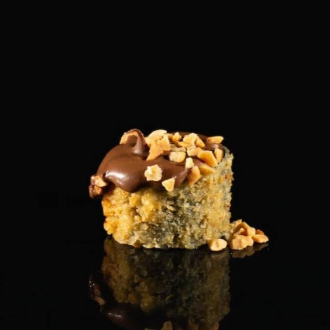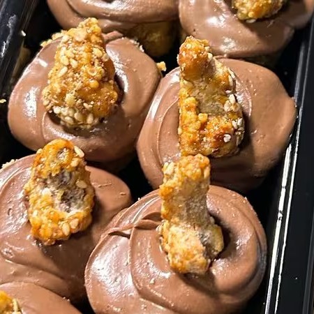 Recheado com cream cheese, finalizado com creme de avelã com cacau, coberto com castanha caramelizada.