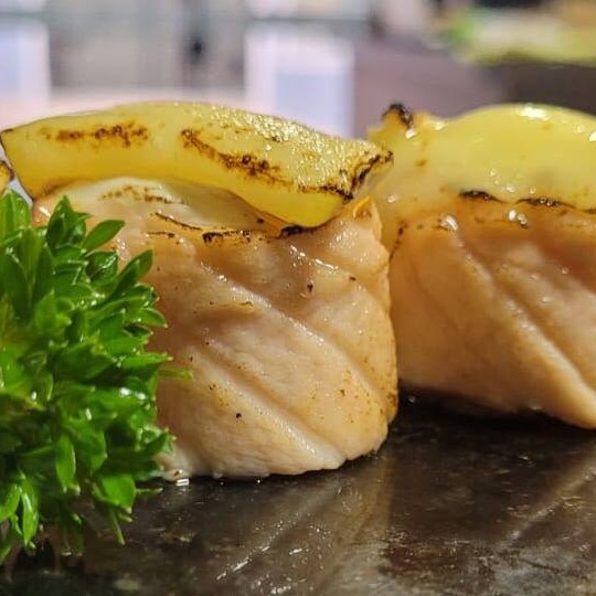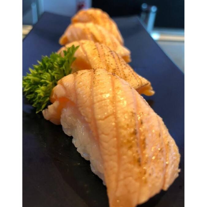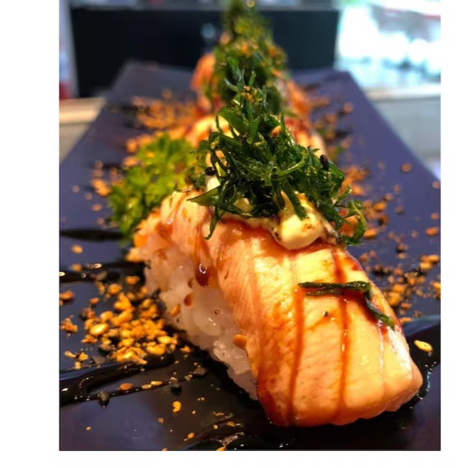 8 uramaki filadélfia, 4 niguiri de salmão, 4 niguiri de salmão selado com sweet chili.