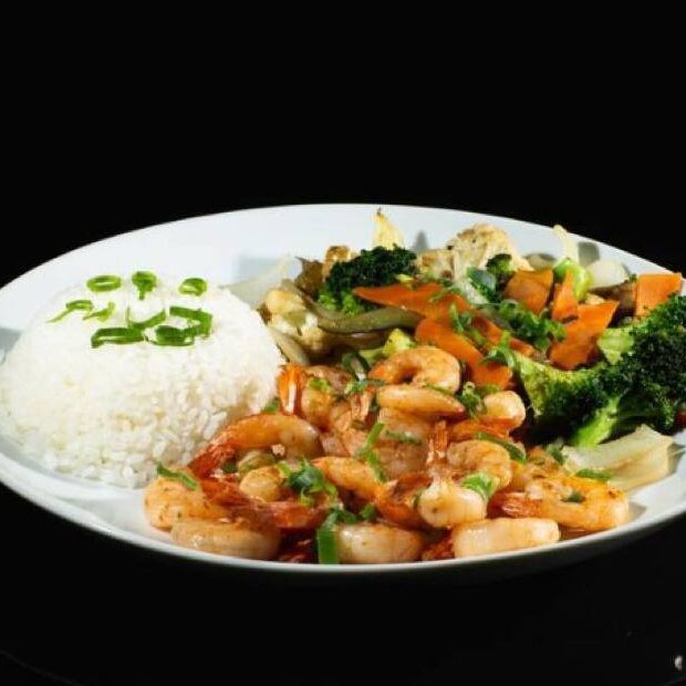 Camarão grelhado e legumes na manteiga, acompanha Gohan