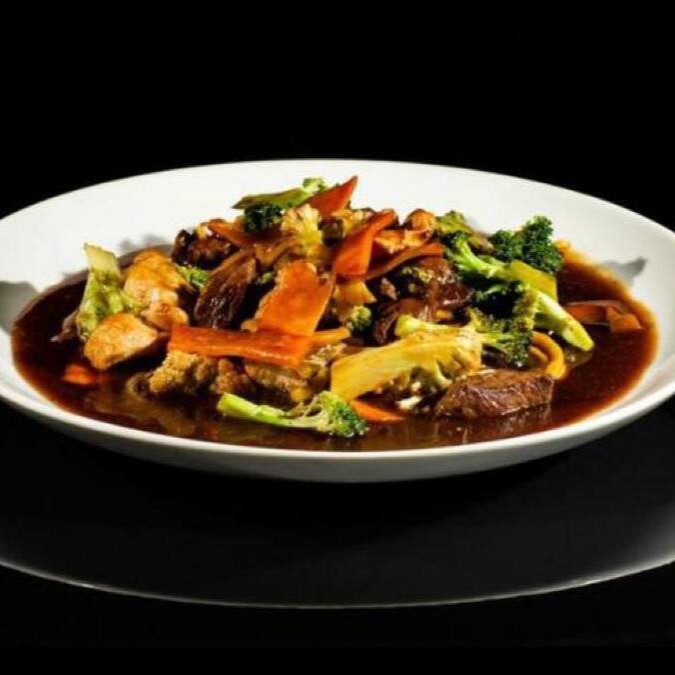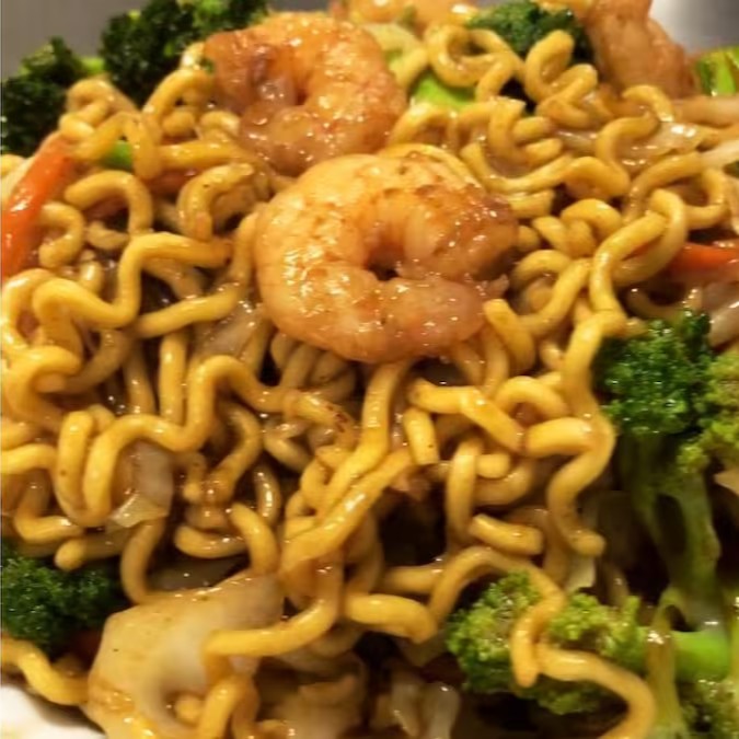 Macarrão, legumes, cebola e com molho especial agridoce.