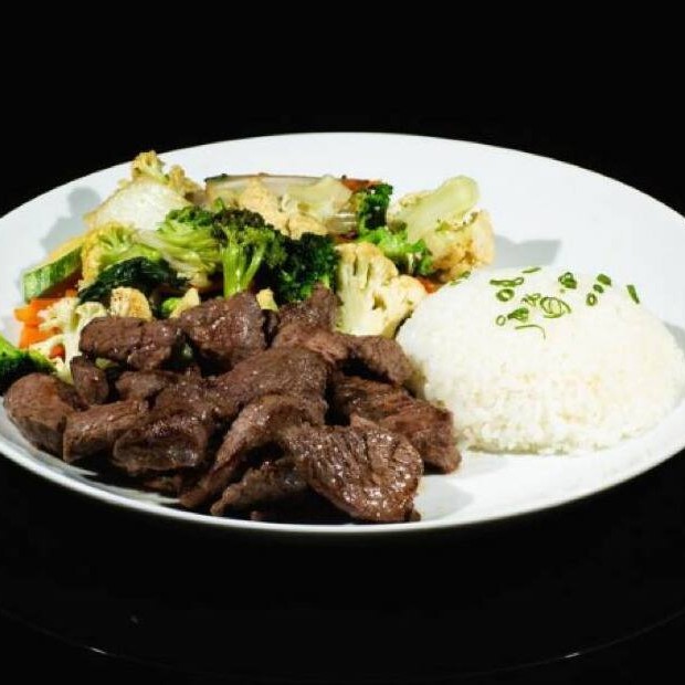 Carne grelhada e legumes na manteiga, acompanha Gohan.