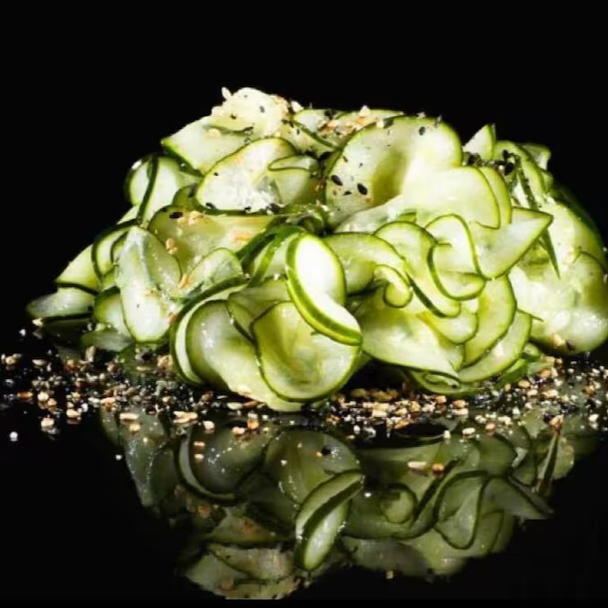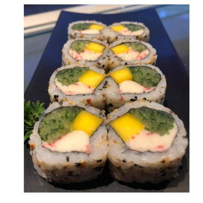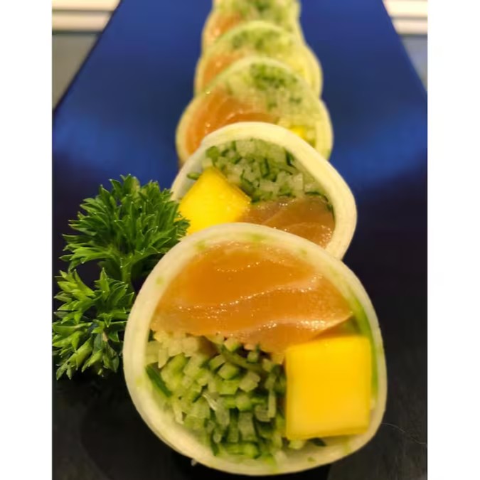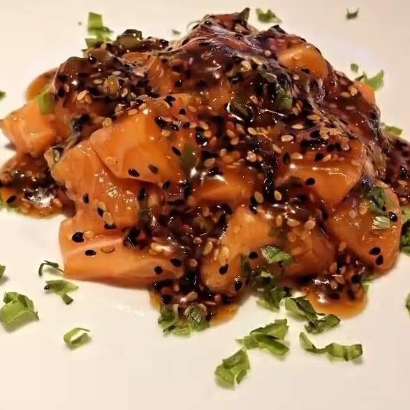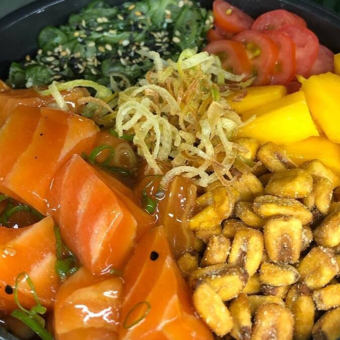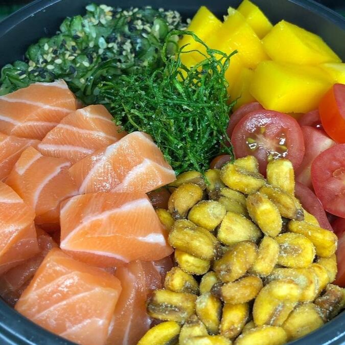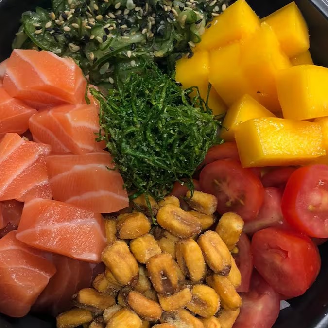 Base arroz de sushi, salmão com molho de ostra, sunomono, tomate cereja, manga, milho peruanoe crispy de alho poró.