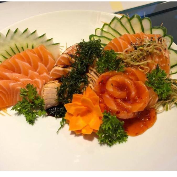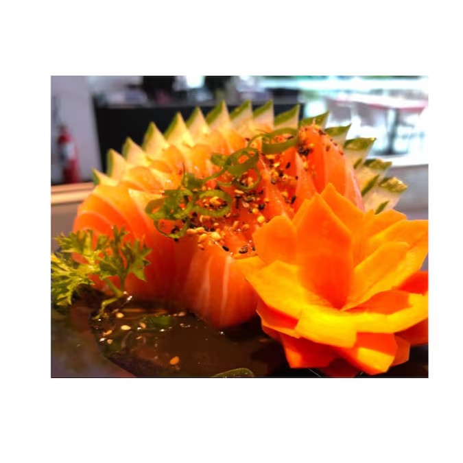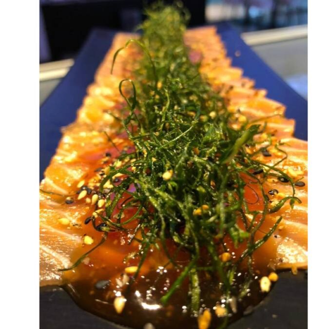 5 sashimi de salmão com molho de ostras, 4 uramaki filadélfia com sweet chili e crispy de couve, 8 uramaki ebitem especial, 4 jow ebitem, 2 niguiri de salmão, 2 niguiri de salmão selado com sweet chili.
