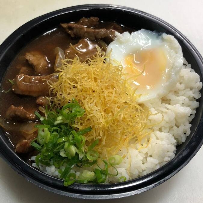Carne com cebola na mantega com molho shoyu, crispy de batata doce, ovo, cebolinha sobre arroz gohan.