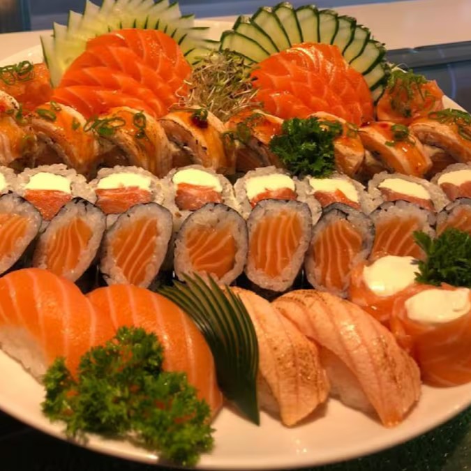 10 sashimi de salmão, 8 uramaki filadélfia, 4 niguiri de salmão, 2 jow, 2 jow com cream cheese (sem arroz), 4 uramaki romeu e julieta.