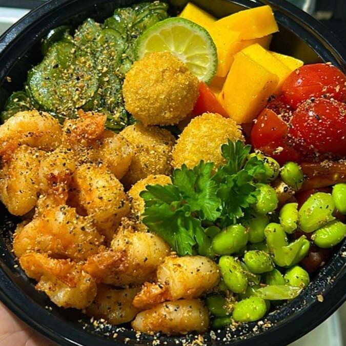 Base arroz de sushi, camarão grelhado, edamame, mini bolinho de salmão, manga, sunomono e tomate cereja.