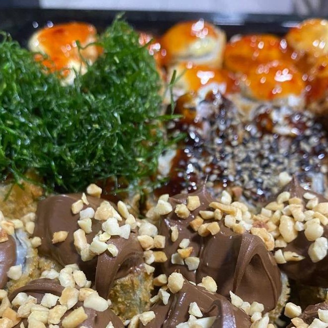 4 hot filadélfia, 4 hot filádelfia (crispy de couve), 8 hot Tai (maracujá e sweet chili), 8 hot de banana com chocolate.