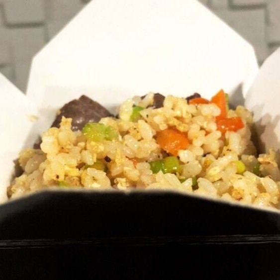 Arroz yakimeshi com sobrecoxa de frango ao molho teriyaki.