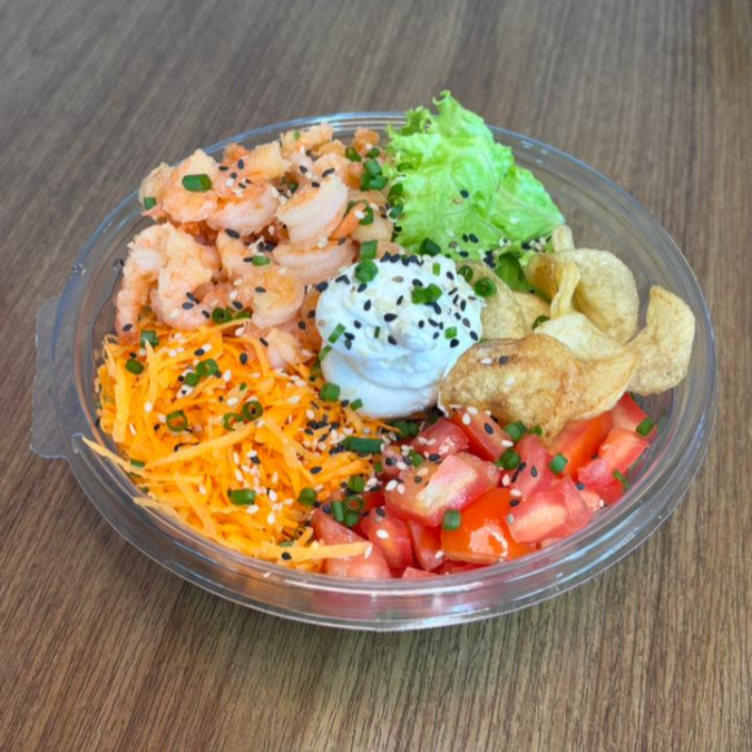 Camarão ao alho e óleo, arroz oriental, mix de folhas verdes, manga, sunomono e batata doce chips. Enviamos shoyu, tarê, hashi e guardanapo. Serve 1 pessoa.