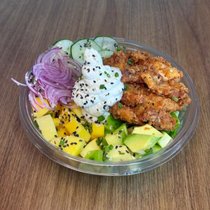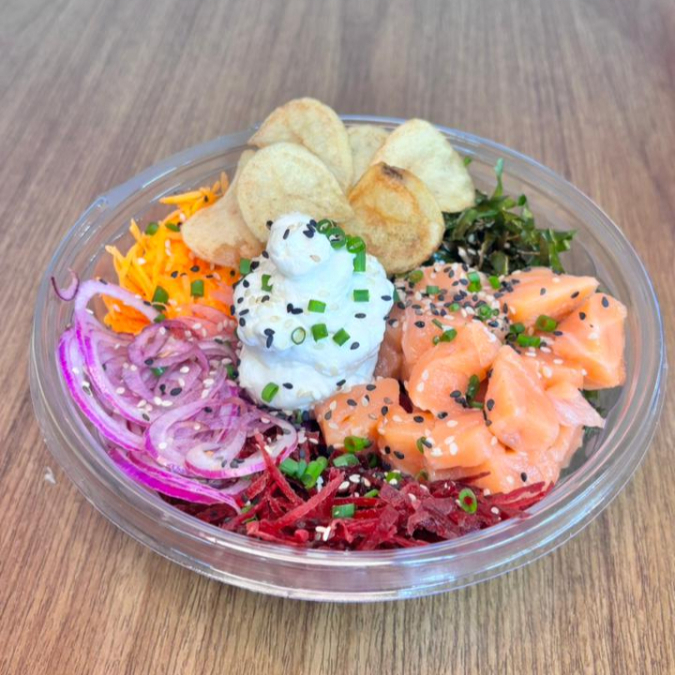 Base de arroz oriental, salmão marinado, manga, abacate, sunomono e cebola roxa. Enviamos shoyu, tarê, hashi e guardanapo. Serve 1 pessoa.