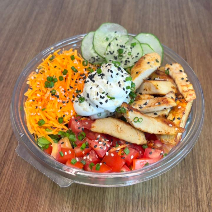 Frango grelhado, mix de folhas, tomate, cenoura ralada e sunomono. Enviamos shoyu, tarê, hashi e guardanapo. Serve 1 pessoa.