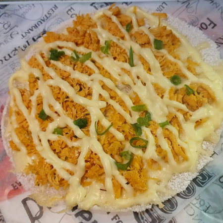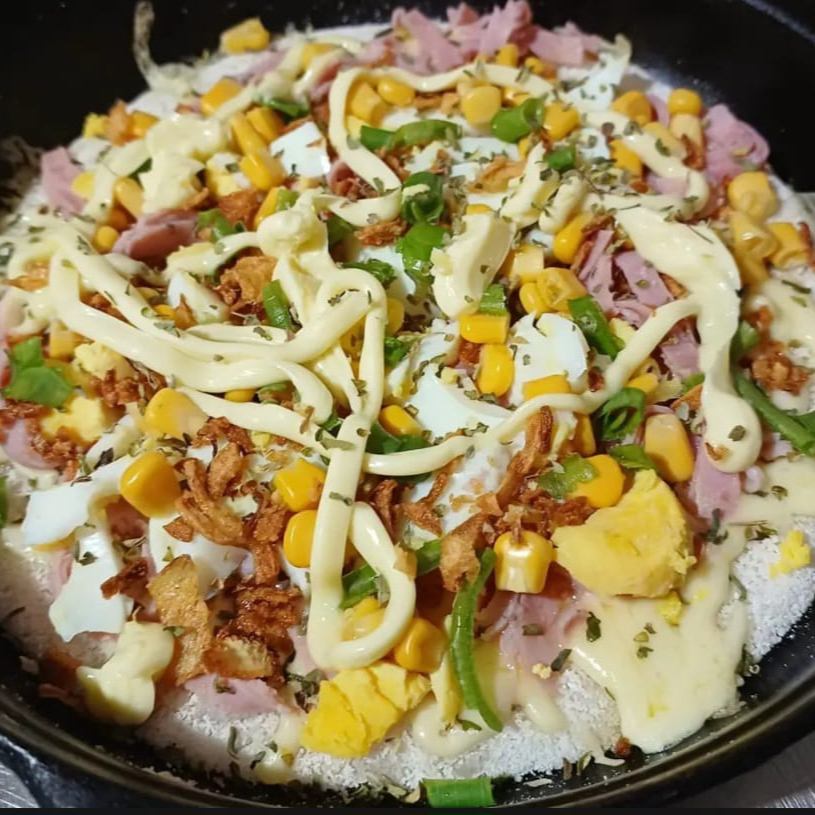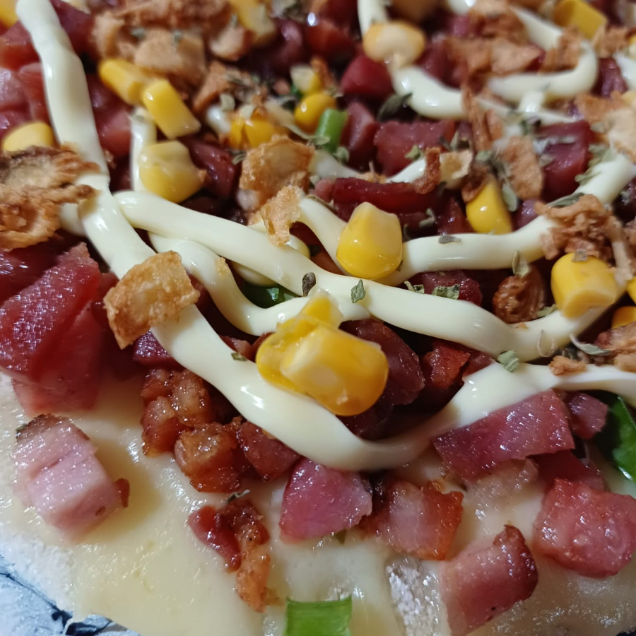 Goma tapioca natural , calabresa, bacon, queijo, milho ,cebola crispy e orêgano.