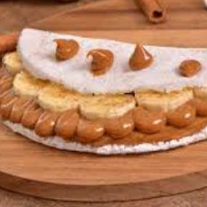 Goma tapioca natural , doce de leite, banana, e farofa de amendoim .