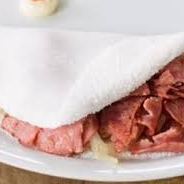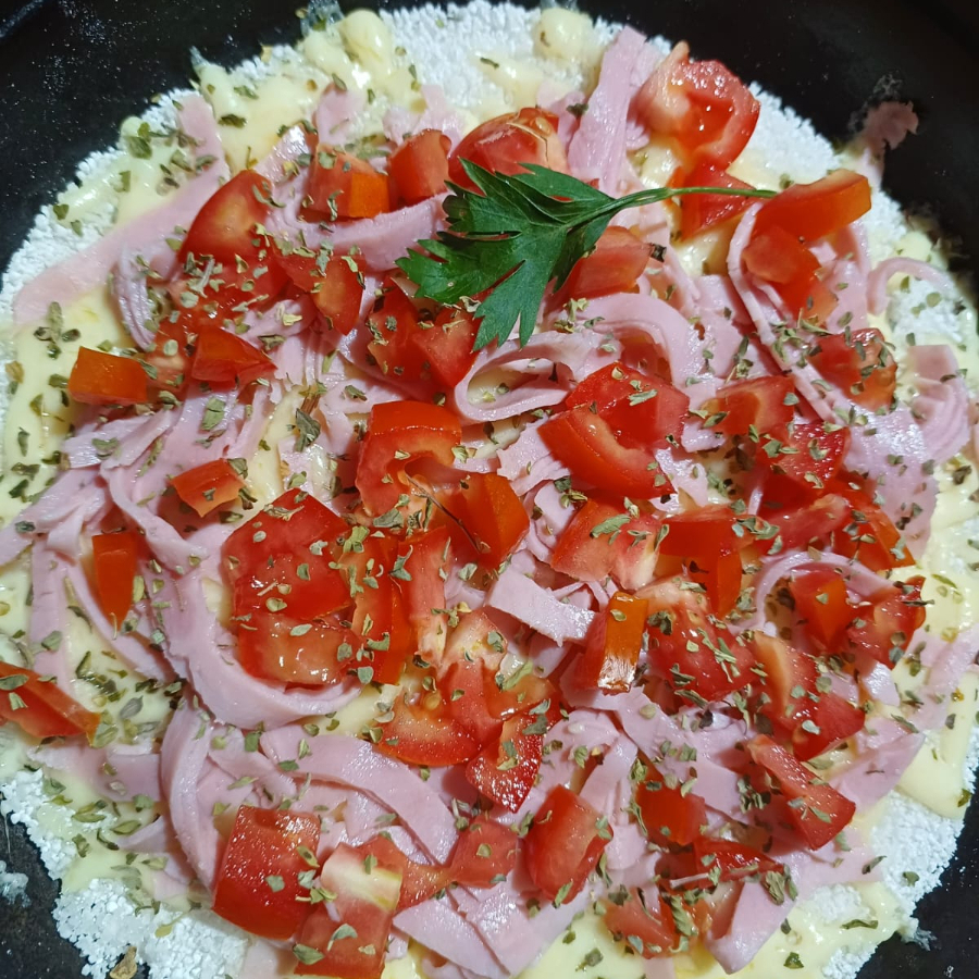 Goma tapioca natural , presunto, queijo, ovo cozido, cebola crispy e orêgano.