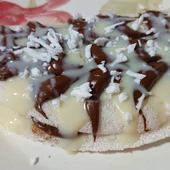Goma tapioca natural , chocolate preto, coco ralado fresco, leite condensado.