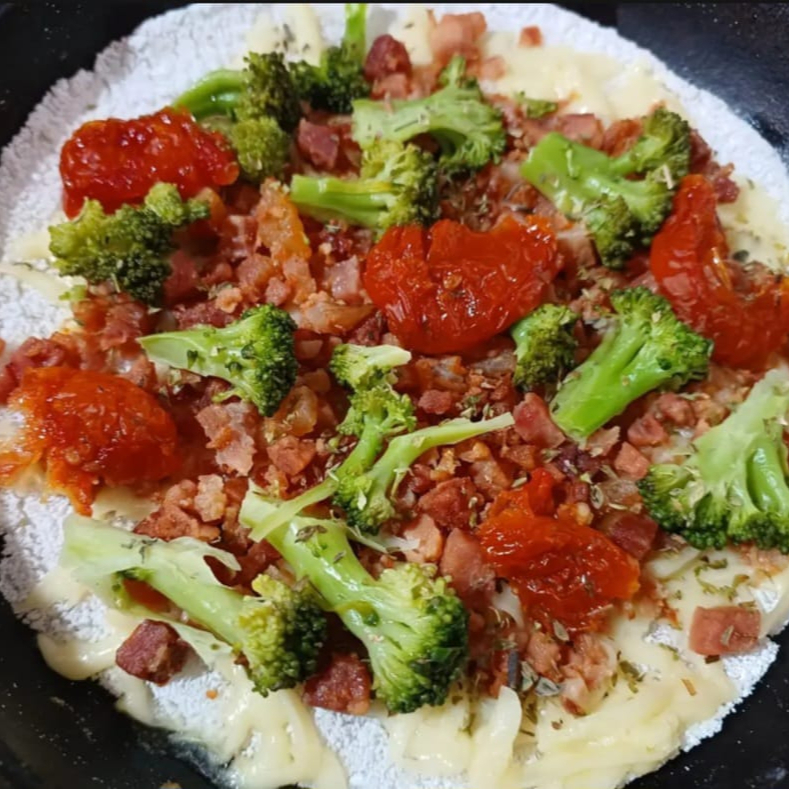 Goma tapioca natural , queijo, bacon, brocolis, tomate seco e orêgano.
