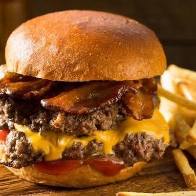 Hambúrguer 120g (blend especial), pão australiano, cervejinha ou de leite , queijo prato, tomate, cebola roxa, fatias de bacon, picles e maionese da casa.