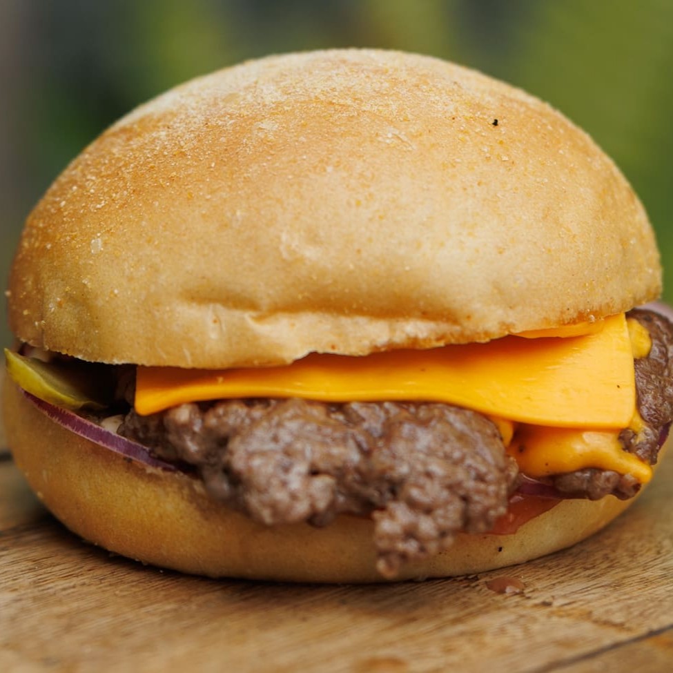 Hambúrguer de carne vegetal, queijo, cebola roxa, maionese, tomate e picles. Feito no pão cervejinha.