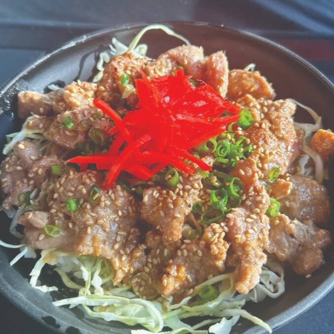 Arroz na base, repolho, sobrepaleta suina, cebola no molho shoyu com gengibre e especiarias