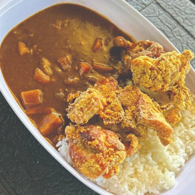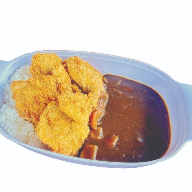Arroz japonês, molho de karê japonês, coxa e sobrecoxa temperada empanado e frito
