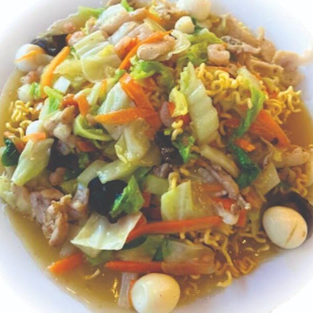 Massa frita e crocante, acompanha um molho especial a base de caldo de frango com cogmelos kikurague, sobrecoxa de frango, camarão 7 barbas, anéis de lula, ovo de codorna , cenoura, repolho e acelga.