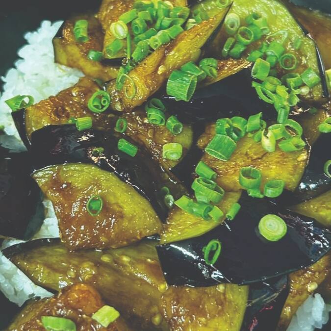 Arroz na base, berinjela frita ao molho de alho, shoyu e especiarias
