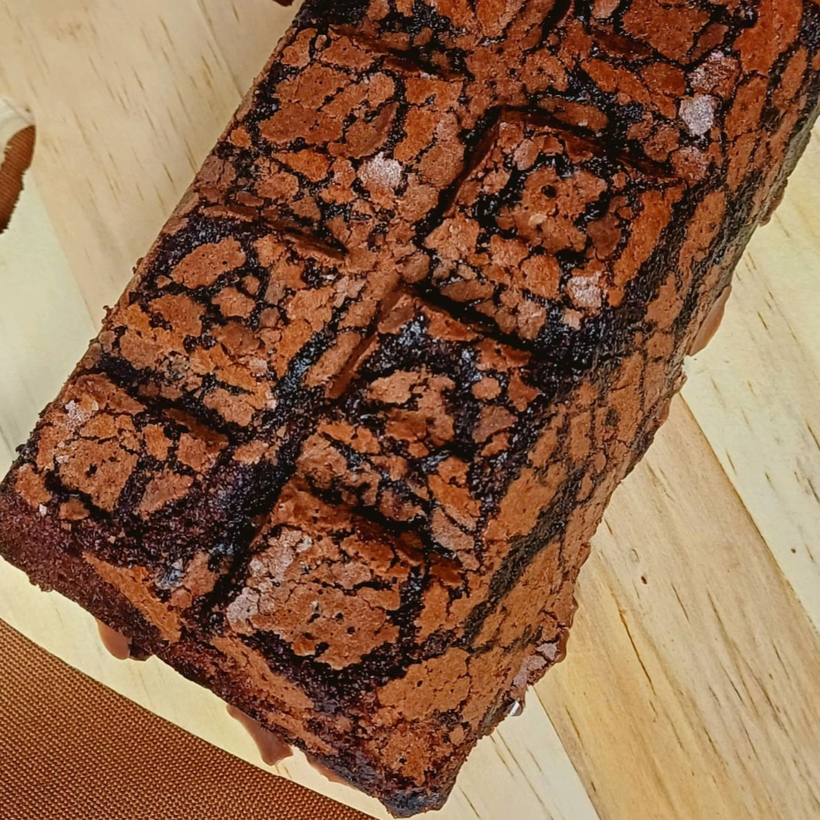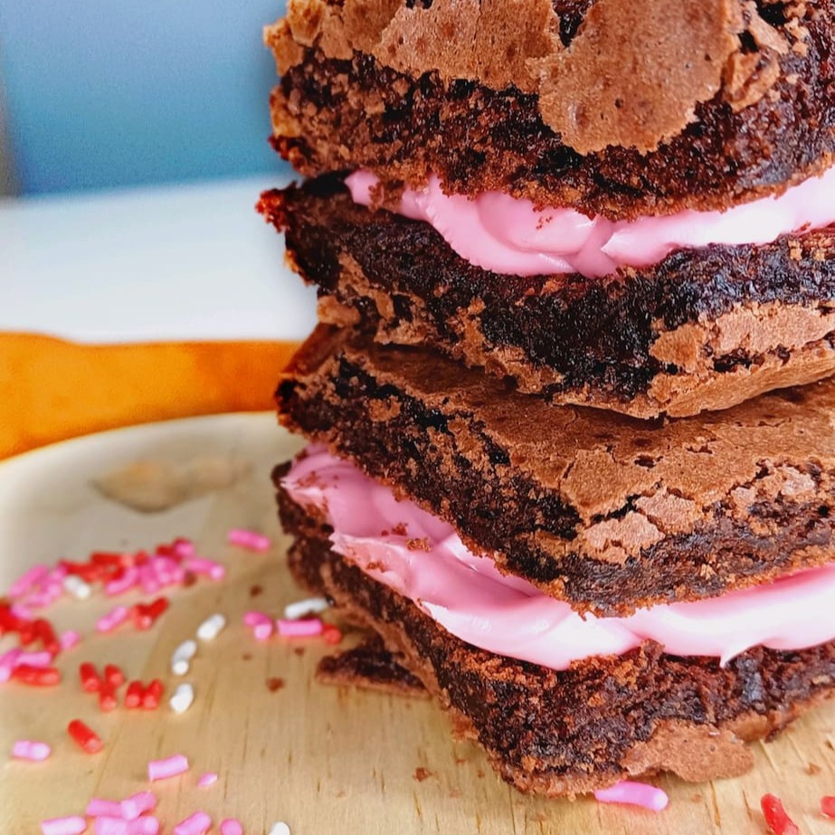 Duas camadas do nosso delicioso brownie 50% cacau, recheado com nosso delicioso creme bueno