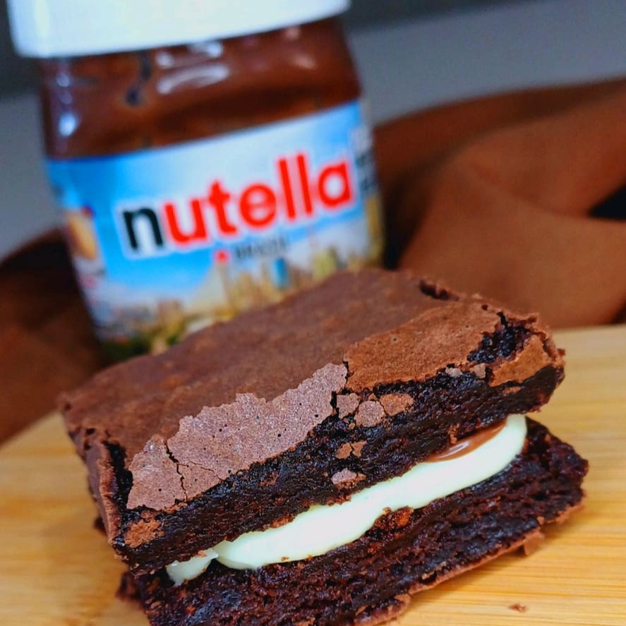 2 deliciosa camada de brownie 50% cacau e bem chocolatudo, molhadinho por dentro e com casquinha crocante por fora, recheado com nosso creme de avelã pura e intensifica ainda mais o sabor do chocolate