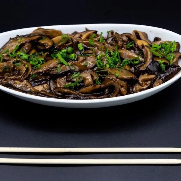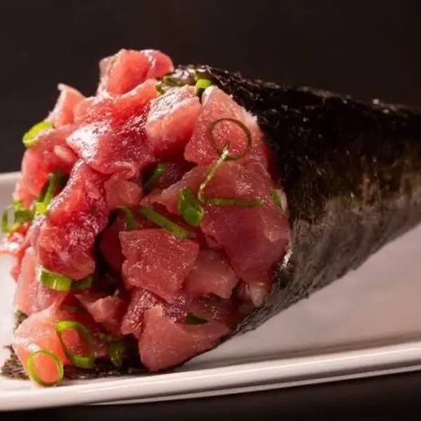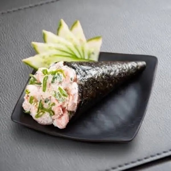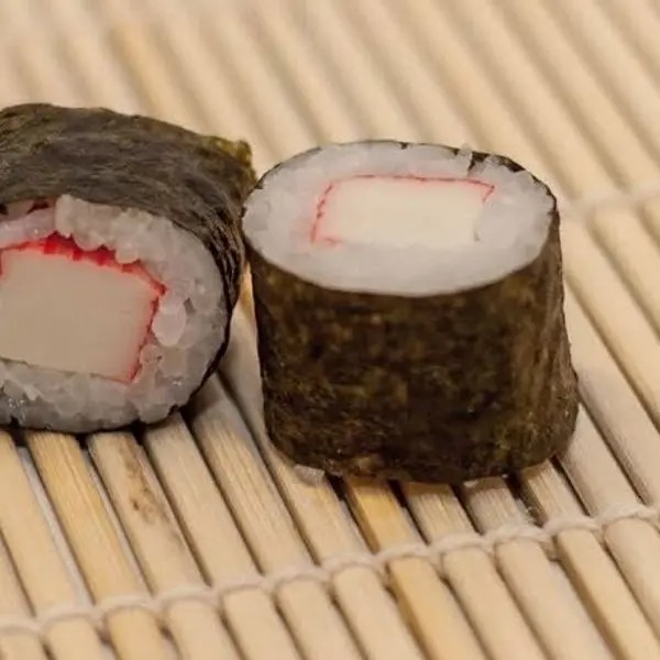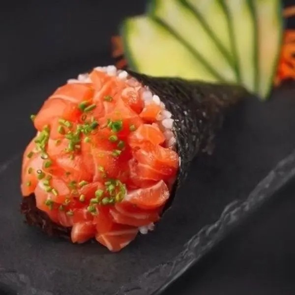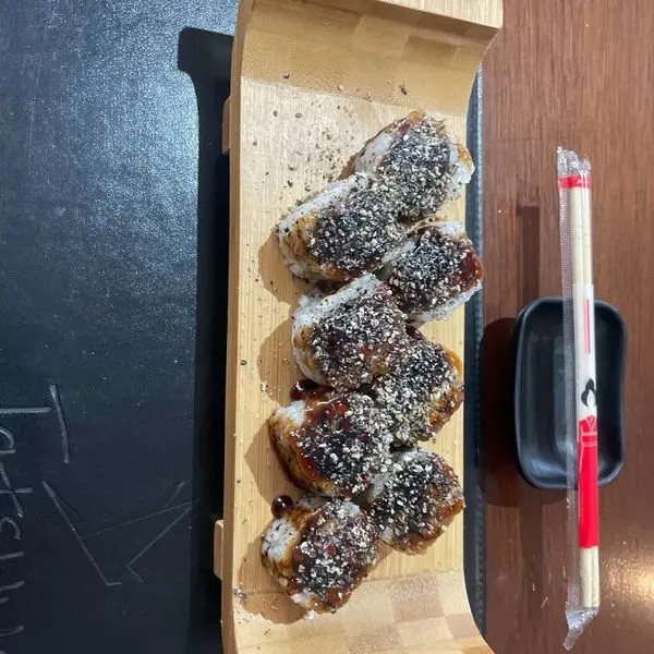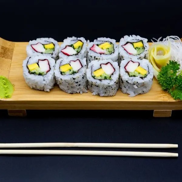 Arroz japonês, kani, pepino japonês, manga, nori, cebola roxa e cebola crispy.