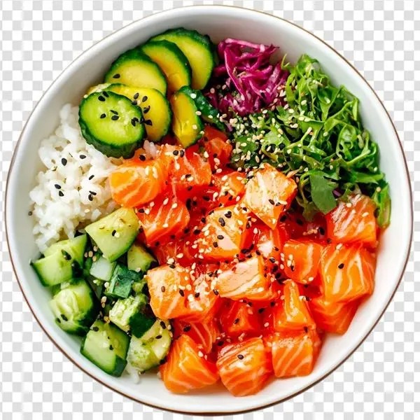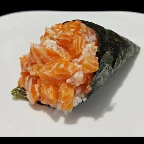 Arroz japonês, salmão em cubos, cream chesse, manga, abacaxi, cebola crispy, cebola roxa, tomate cereja e nori.