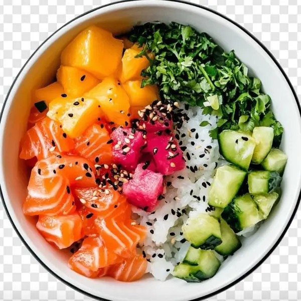 Arroz japonês, salmão em cubos, cebola roxa, cebola crispy, abacaxi, manga, tomate cereja e nori.