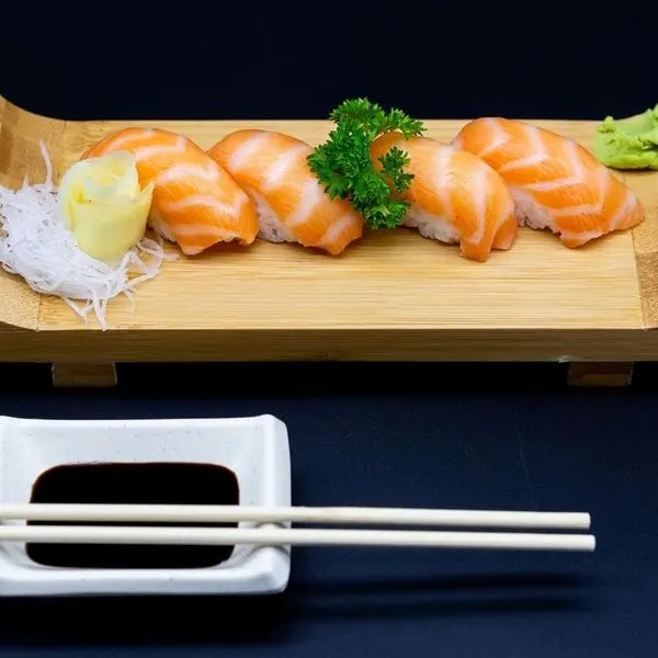 6 sashimi de salmão, 4 niguiri de salmão, 8 Philadelphia de salmão.