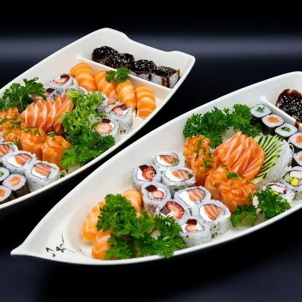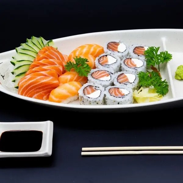 4 joe de salmão, 8 Philadelphia de salmão, 4 niguiri de salmão, 6 sashimi de salmão, 4 hossomaki de salmão, 4 niguiri de atum, 6 sashimi de atum, 4 hossomaki de atum, 8 romeu e julieta 4 uramaki skin,
