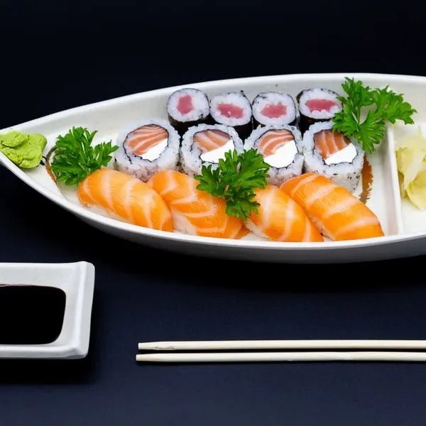 4 niguiri de salmão, 4 Philadelphia de salmão, 4 hossomaki de atum.