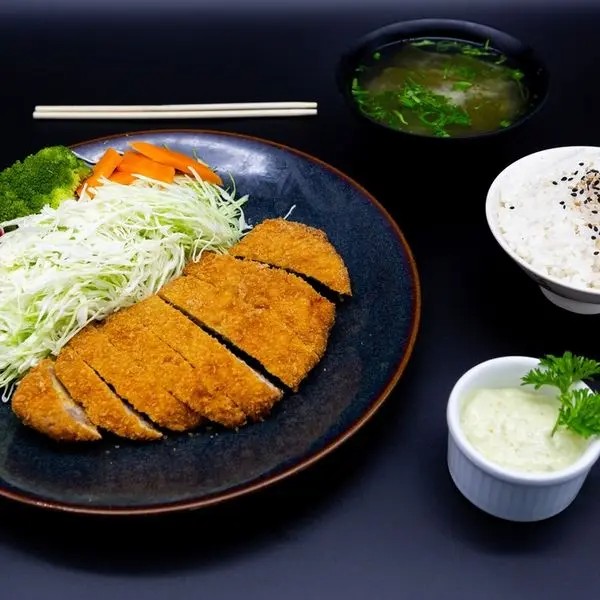 Acompanha lombo de porco à milanesa, salada, goham e missoshiru.