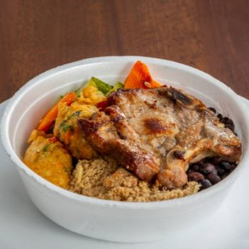 Arroz, feijão, farofa, legumes do dia e macarrão, bolinho de arroz