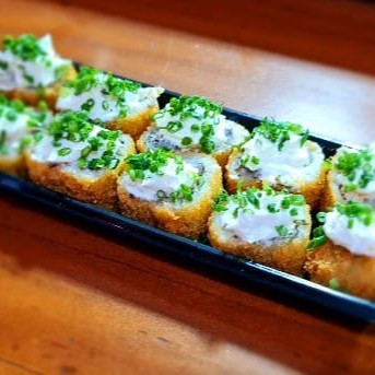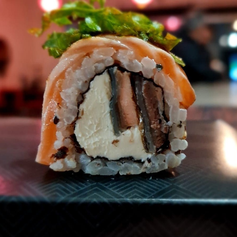 Sushi de salmão, enrolado no arroz, com cream chesse e alho poró por cima.