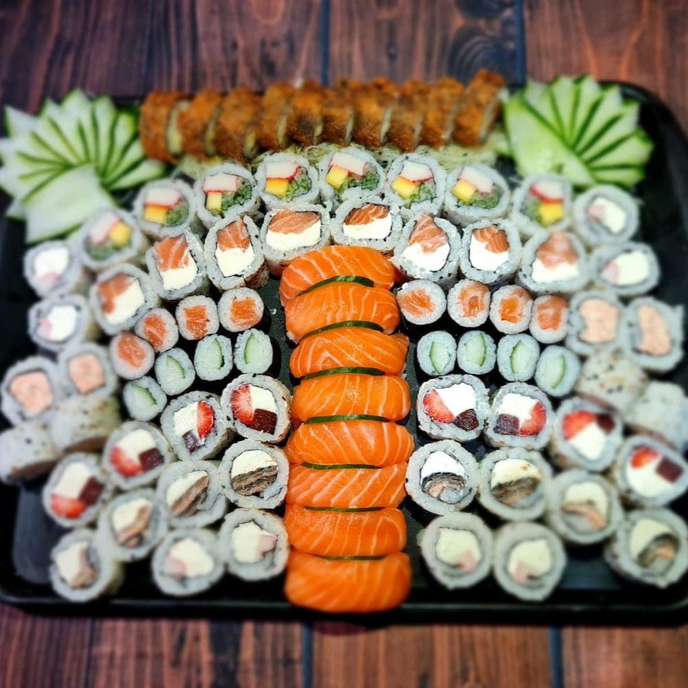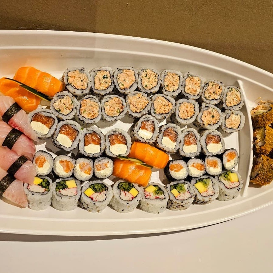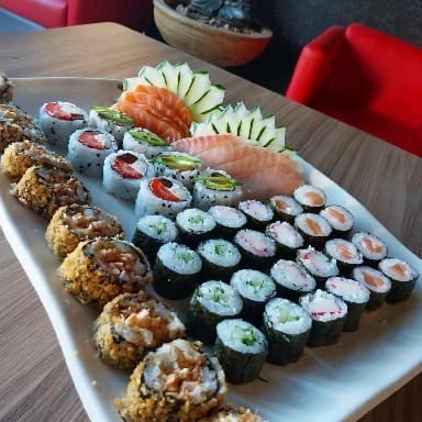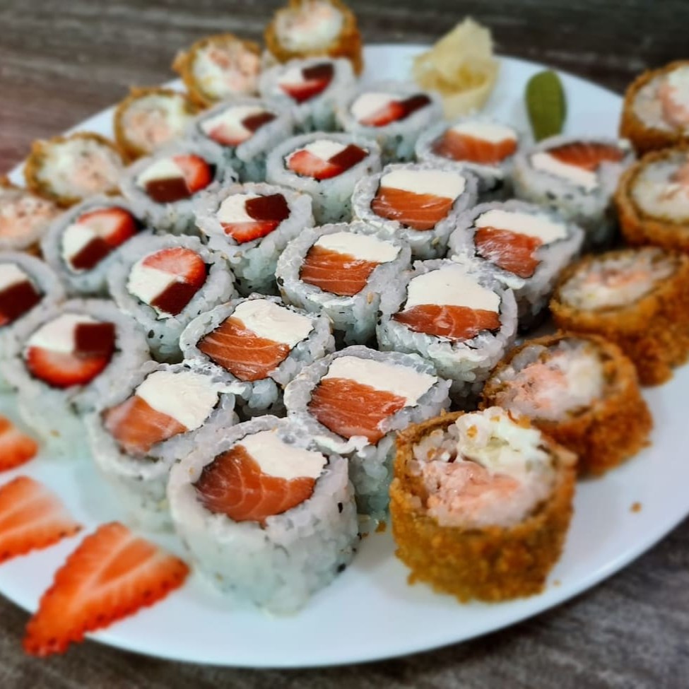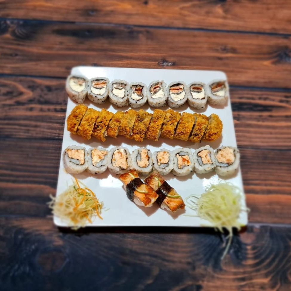 10 Uramaki Filadelfia, 10 Uramaki Romeu e Julieta, 10 Uramaki California, 10 Uramaki Niro, 10 Uramaki Skin, 10 Hossomaki Salmão, 10 Hossomaki Kani, 10 Hossomaki Pepino, 5 Niguiri Salmão, 5 Niguiri Tilapia, 10 Hot Filadelfia.
