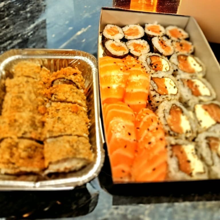 8 Uramaki filadelfia, 8 Hossomaki salmão, 4 Niguiri salmão, 8 Hot Filadelfia.