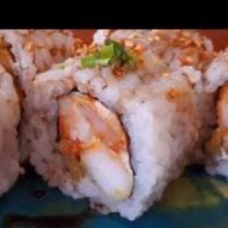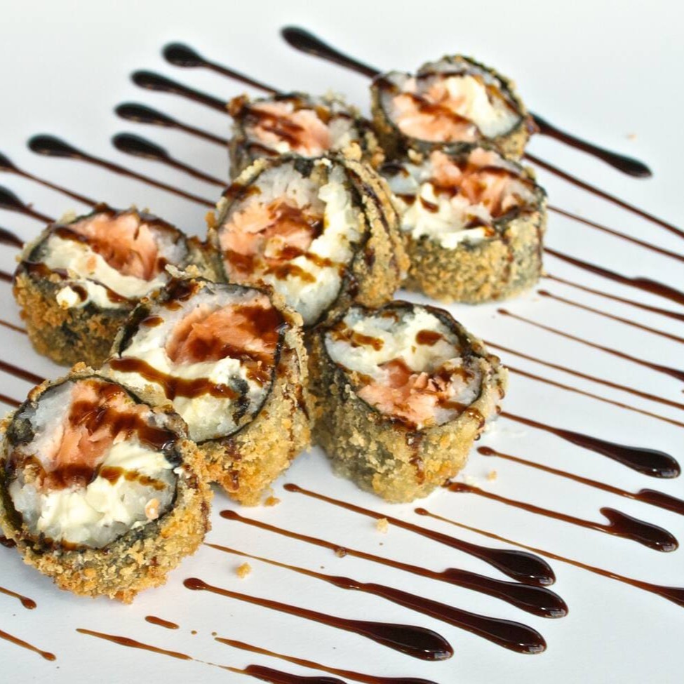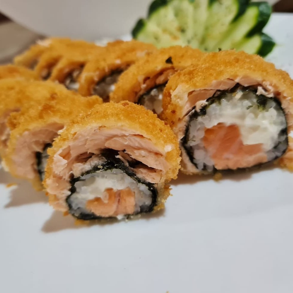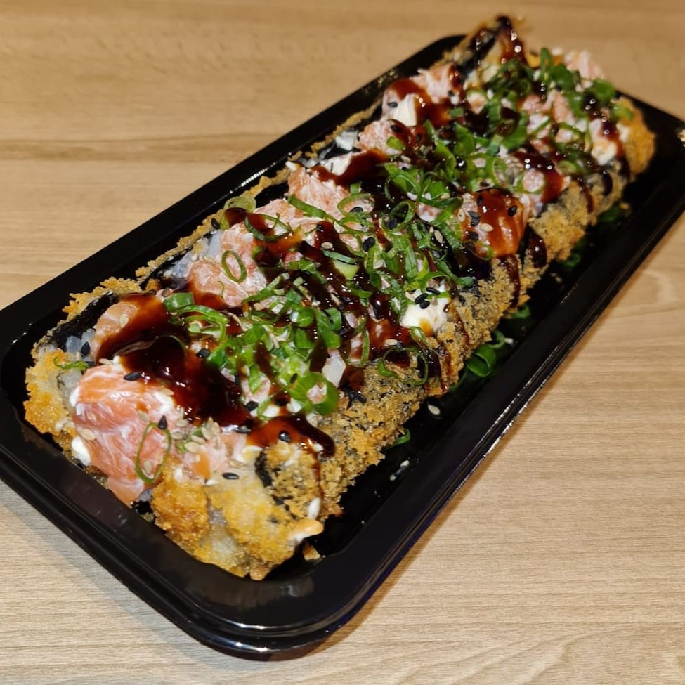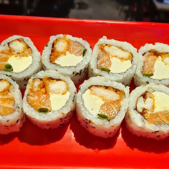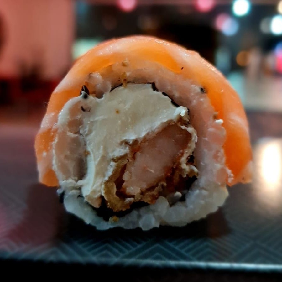 Sushi de salmão ,enrolado no arroz, com cream chesse e camarão empanado em cima