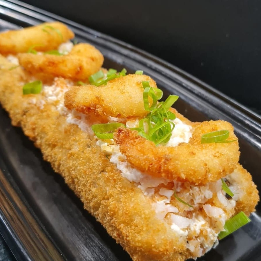 Hot roll de camarão, aberto e recheado com camarão empanado batido com cream chesse + camarão e cebolinha por cima.