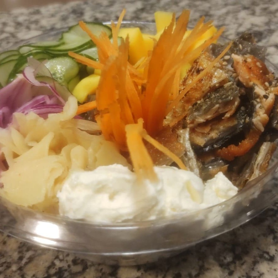 Arroz,alga,pele de salmao grelhada e cream chesse,com couve frita em cima