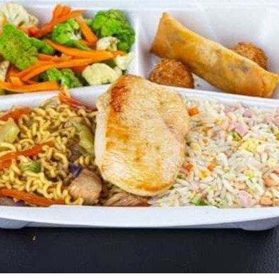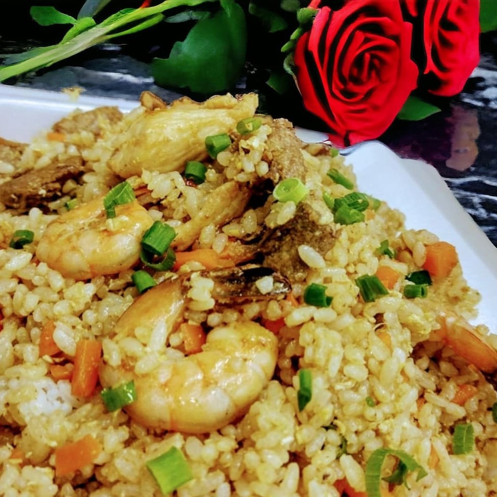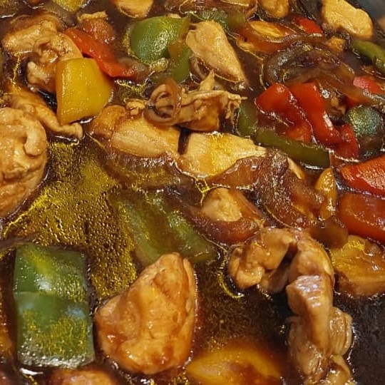 Um delicioso molho da casa, frango, amendoim, pimentões. Acompanha gohan.