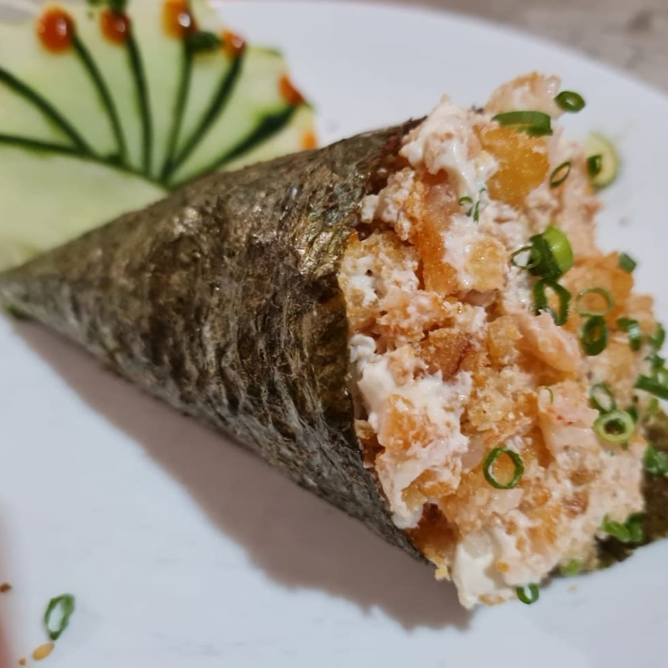 2 Unidades De Temaki Hot Tamanho Medio. Arroz, Salmão E Cream Chesse Batido Tipo Pate, Empanados Em Farinha Panko E Fritos