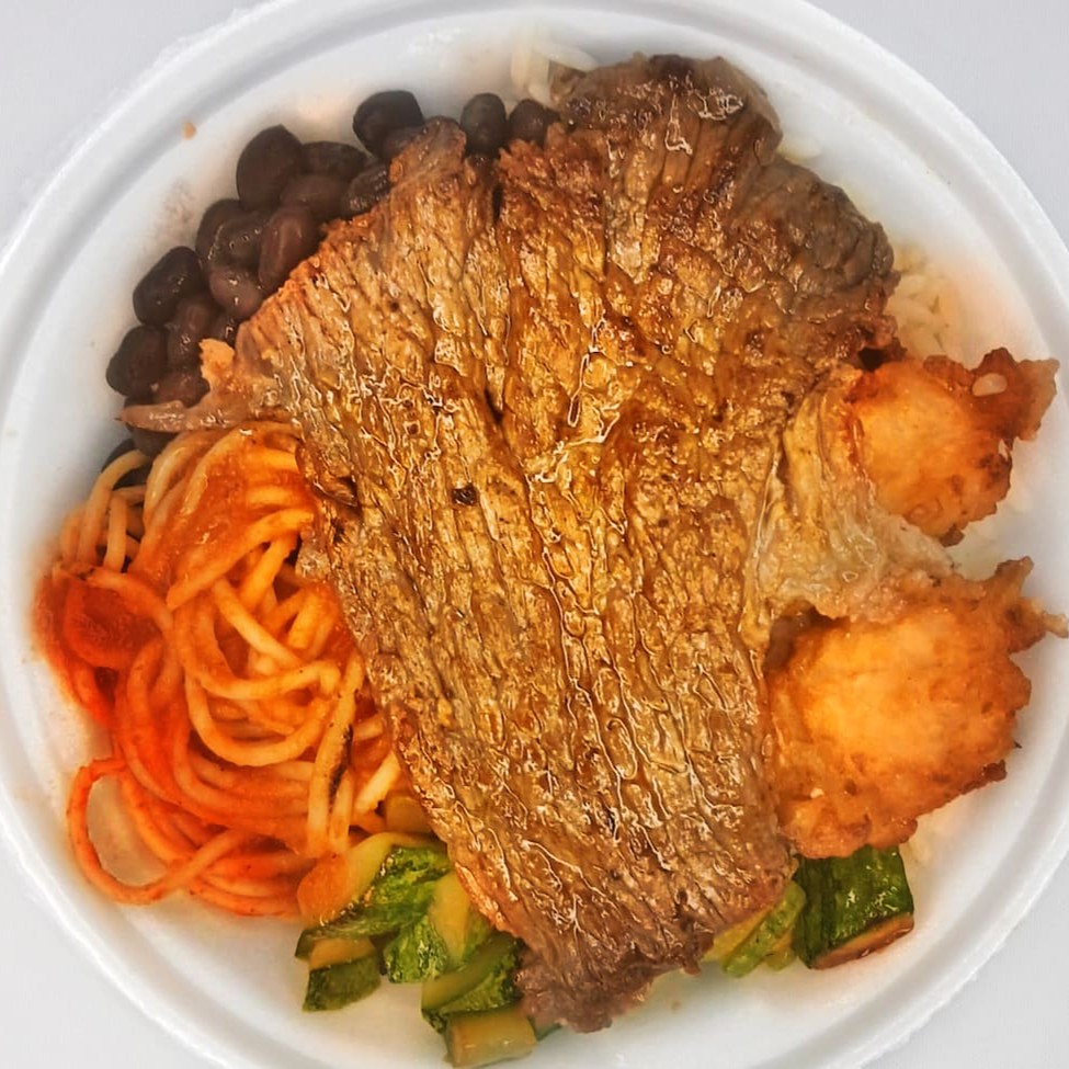 Grelhados, Milanesas, Bife a rolê e Parmegianas acompanham: Arroz + Feijão + Macarrão + Batata frita 🍛 Marmita de Strogonoff Acompanha Arroz + Strogonoff cremoso + Batata palha