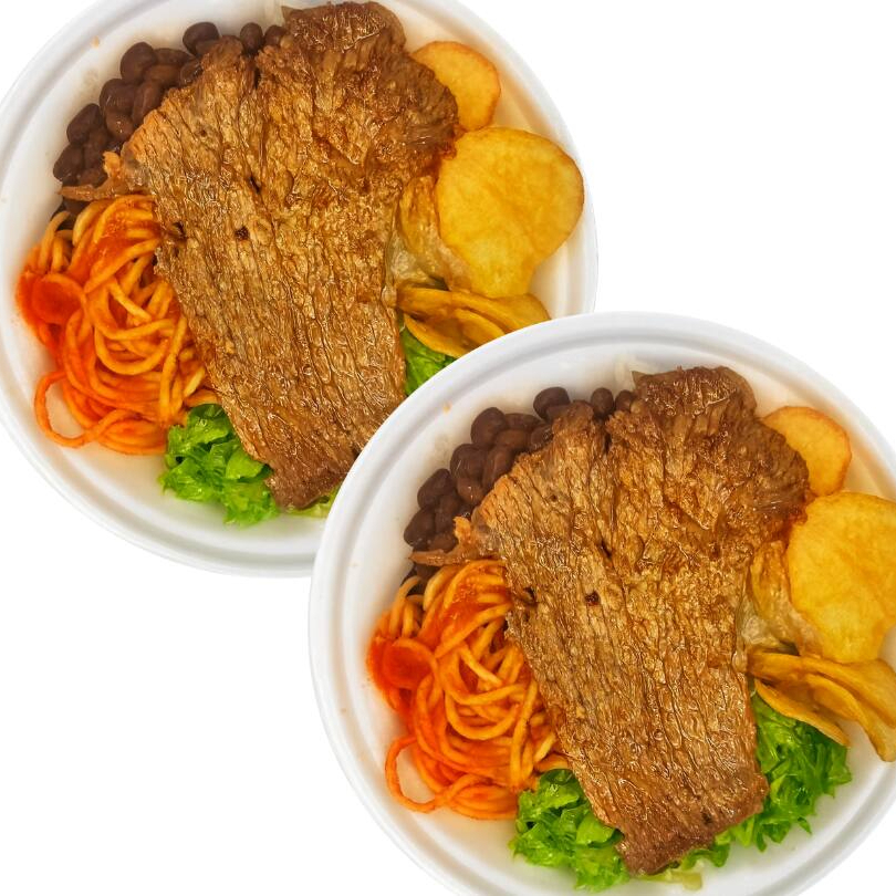 Duas deliciosas marmitas cada com uma das opções do dia a sua escolha, arroz, feijão preto(ou branco se desejar), macarrão com molho do dia(vermelho ou alho e óleo), farofa, refogado do dia e fritura do dia!