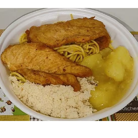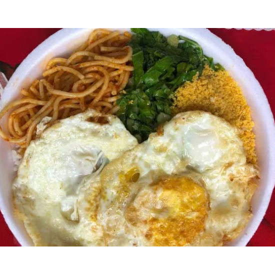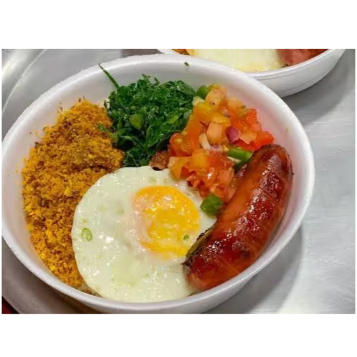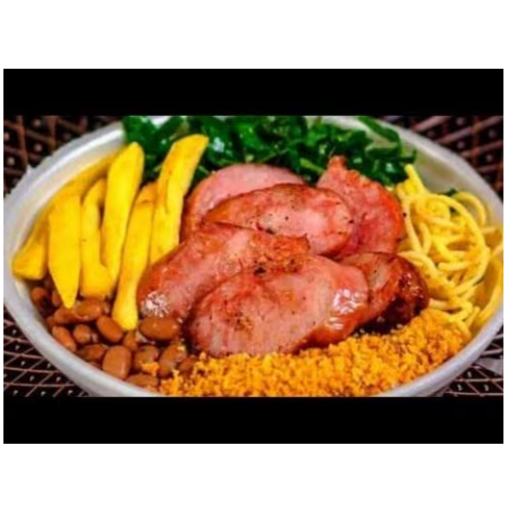 1 marmita g feijoada, 1 marmita media arroz,1 media farofa, refogado ,banana milanesa e laranja