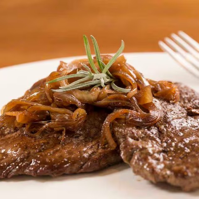 Uma porção extra de bife acebolado à moda Tempero do Chef.