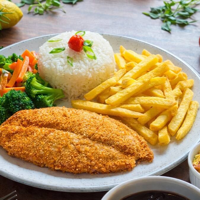Tilápia à milanesa com arroz, feijão, batata frita, farofa e legumes na manteiga.