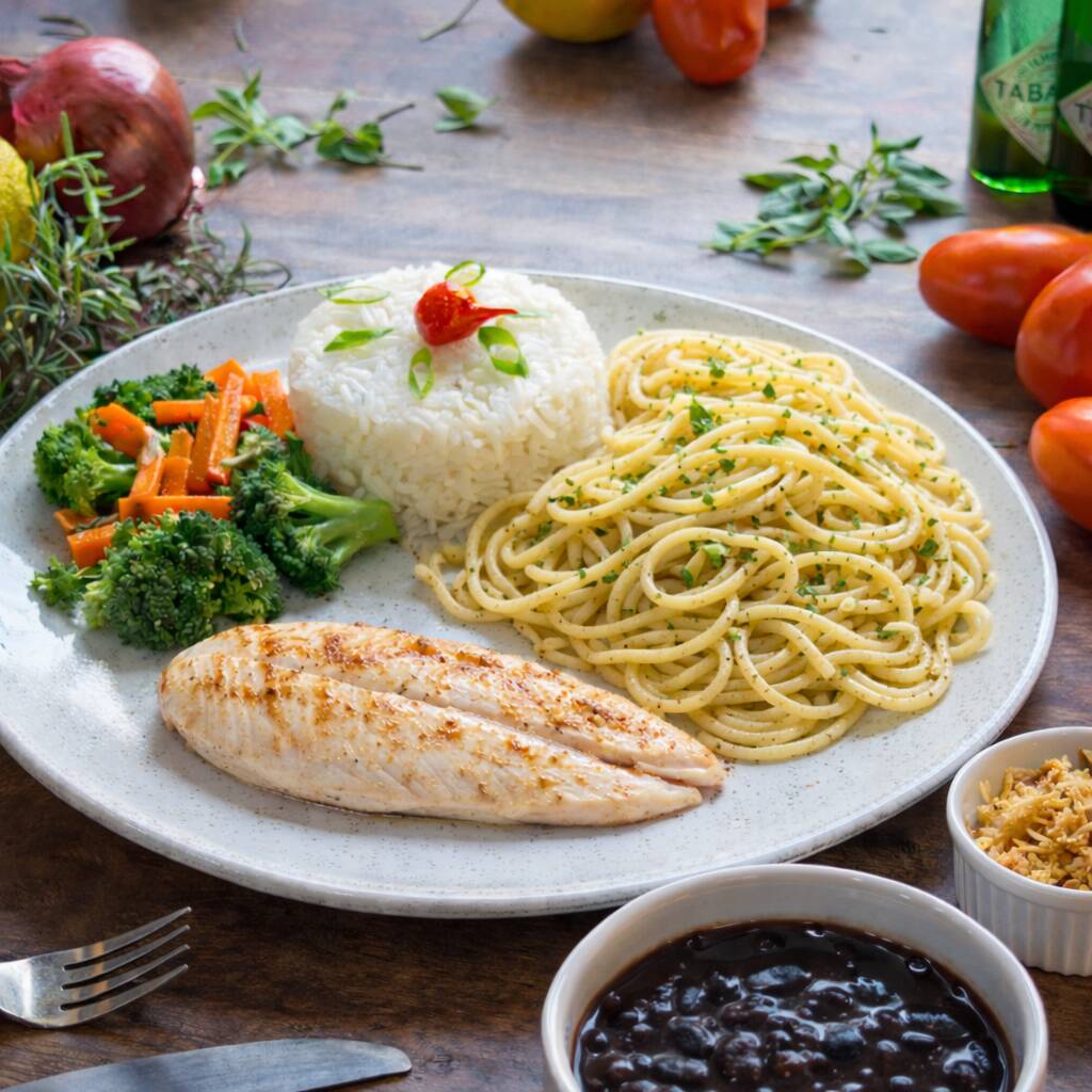 Peito de frango grelhado com arroz, feijão, espaguete alho e óleo, farofa e legumes na manteiga.